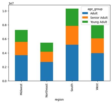 The graph above shows us the breakdown of our three largest shopping groups by age and region